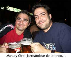 Manu y Ciro jarreándoseDe este modo, la noche se convirtió en una discusión sobre cine friki de serie B, series de culto («Prison Break», «Perdidos», «Arrested development», «Firefly»… y por supuesto clásicos como «Los Simpson», «South Park» o «Seinfeld») todas salieron a colación e intercambiamos recomendaciones durante toda la noche. También hablamos de Alatriste (sin haberla visto ninguno, que listos somos) del futuro del cine español, de videojuegos (y de como ya no se hacen juegos como los de antes) y de la vida en general. Reinó la nostalgia, pero hubo también tiempo para las risas y para hacer nuevos planes de quedar, en los que esperamos que se apunte más gente al evento.