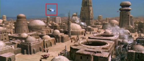 En la edición especial de «Una nueva esperanza», puede verse el Jinete del Espacio despegando de Mos Eisley.