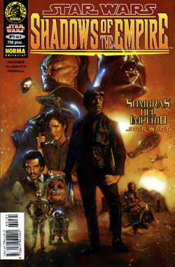 Star Wars - Sombras del Imperio - Portada del cómicEsta edición de Norma, publicada originalmente por Dark Horse Comics, con guión de John Wagner y dibujos de Kilian Plunkett, se divide en tres números (a 750 pesetas cada uno) que, en esencia, repiten la misma historia que cuenta la novela. Es más, en la versión original en inglés, hasta coinciden los diálogos.